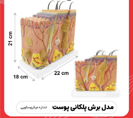 این مدل قسمتی از پوست انسان را در سه لایه نشان میدهد.در لایه اول موهای زائد، غدد عرق و چربی در لایه دوم گیرنده ها و اعصاب و در لایه سوم رگ های خونی با اندازه ای 100 برابر اندازه واقعی نمایش داده شده است.